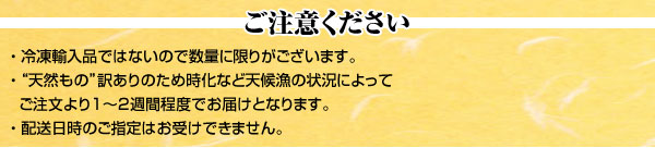 天然もの訳ありのため時化など天候、漁の状況によってお届け日数が変わります。注文決済画面にて、詳細情報をご入力下さい。