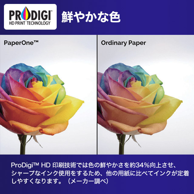 ProDigi(TM) HD 印刷技術では色の鮮やかさを約34%向上させ、シャープなインク使用をするため、他の用紙に比べてインクが定着しやすくなります。(メーカー調べ)
