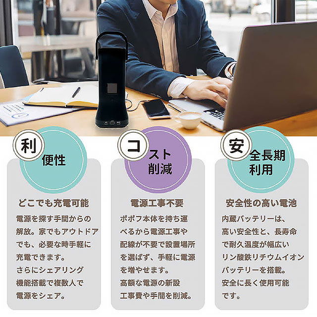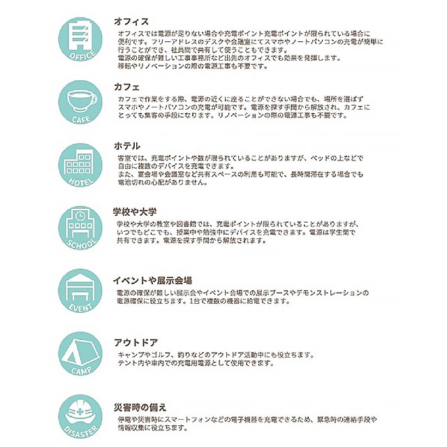 オフィスやご家庭、アウトドアなど必要な時に手軽に充電できます。
