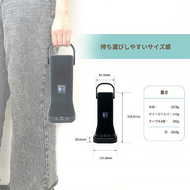 持ち運びやすいサイズ感と大容量のバッテリーを備え、電源をシェアできる!