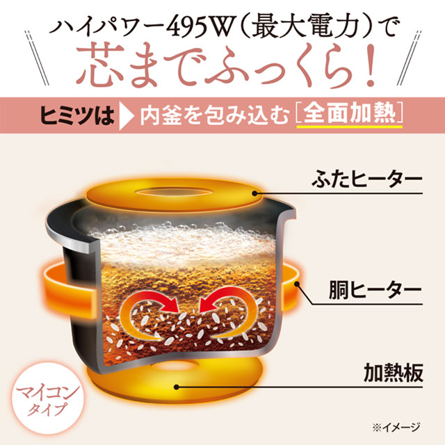 最大495Wの大火力と釜全体を包み込む全面加熱が、芯までふっくら炊き上げます。