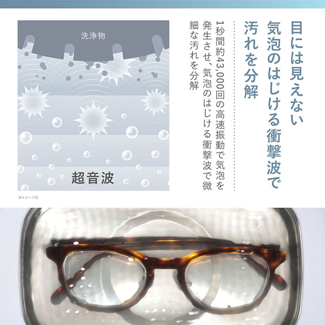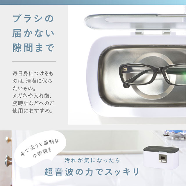 メガネや入れ歯、腕時計など毎日身につける物を、超音波の力で簡単に洗浄できます。